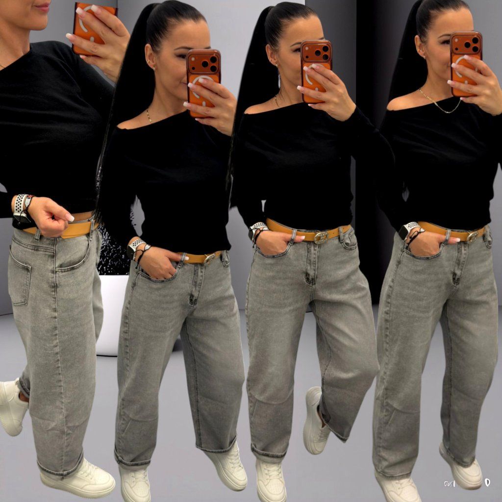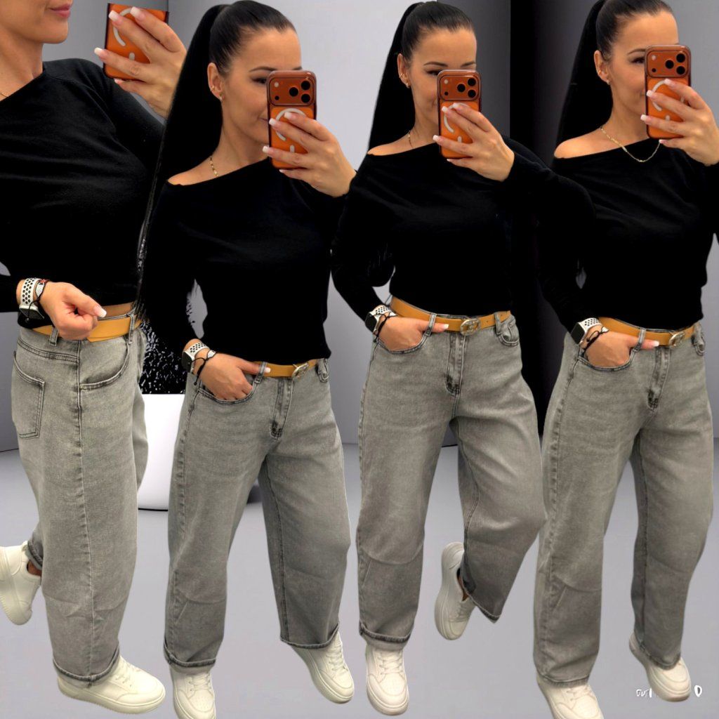 Stylové šedé džíny s vyšším pasem a moderním volnějším střihem, který krásně sedí na postavě a zároveň je velmi pohodlný na nošení. Součástí kalhot je také pásek, který outfit skvěle doplňuje a zvýrazní pas.