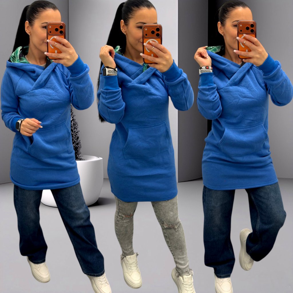 Díky prodlouženému střihu krásně kryje záda i boky, zatímco měkký, hřejivý materiál se postará o komfort po celý den. Výrazná, netradičně řešená kapuce dodává mikině moderní a originální vzhled.